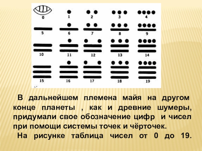 и древние шумеры, придумали свое обозначение цифр и чисел при помощи системы точек и чёрточек.
