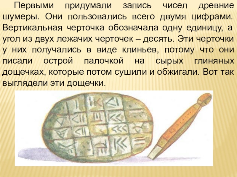 Слайд 7Первыми придумали запись чисел древние шумеры. Они пользовались всего двумя цифрами.