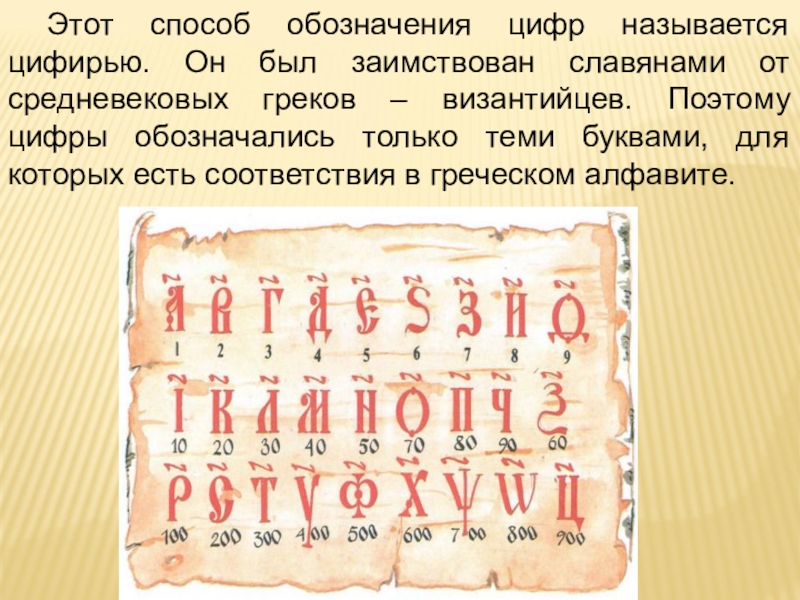 Слайд 17Этот способ обозначения цифр называется цифирью. Он был заимствован славянами от