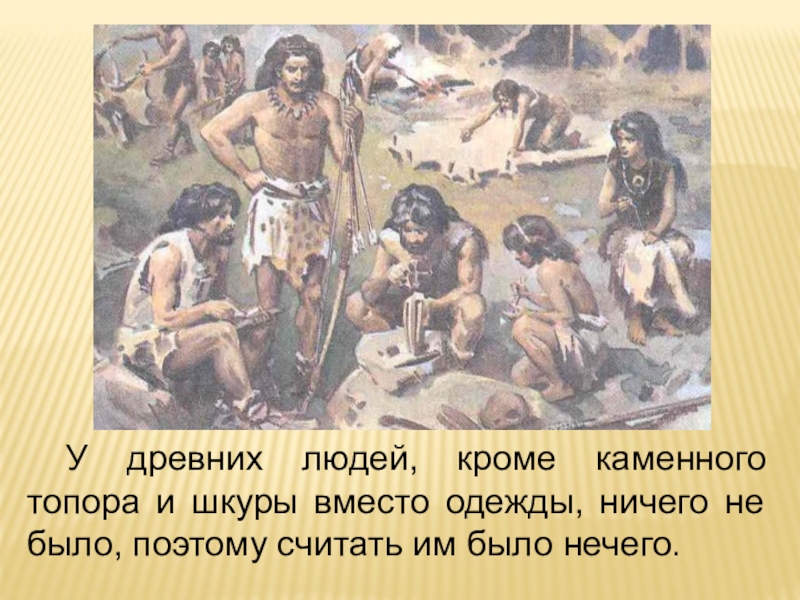 Слайд 2У древних людей, кроме каменного топора и шкуры вместо одежды, ничего