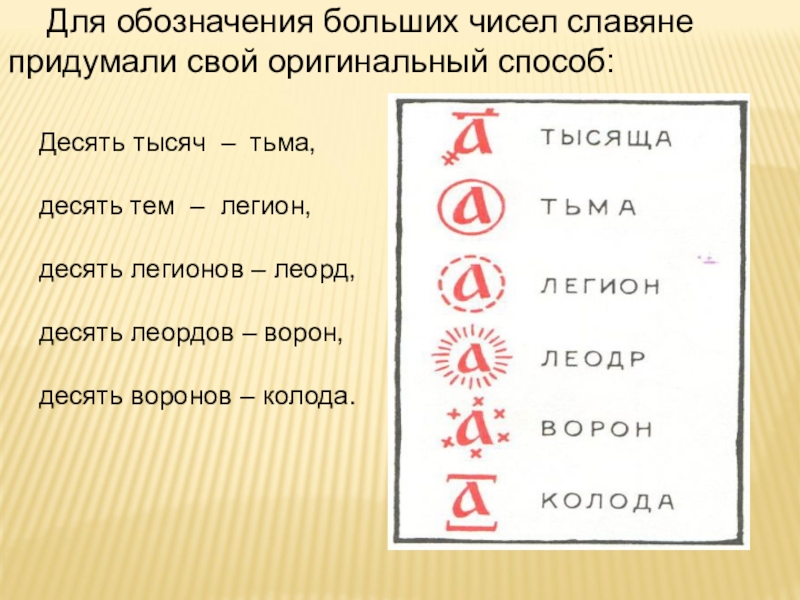 Слайд 18Для обозначения больших чисел славяне придумали свой оригинальный способ: