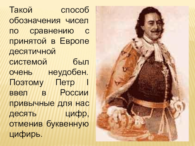 системой был очень неудобен. Поэтому Петр I ввел в России привычные для нас десять цифр, отменив буквенную цифирь.
