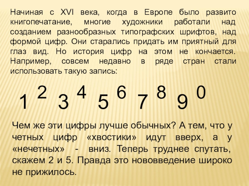 Чем же эти цифры лучше обычных? А тем, что у четных цифр «хвостики» идут вверх, а у «нечетных» - вниз. Теперь труднее спутать, скажем 2 и 5. Правда это нововведение широко не прижилось.