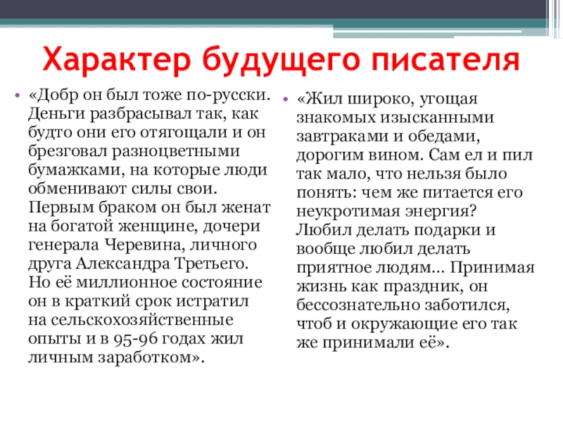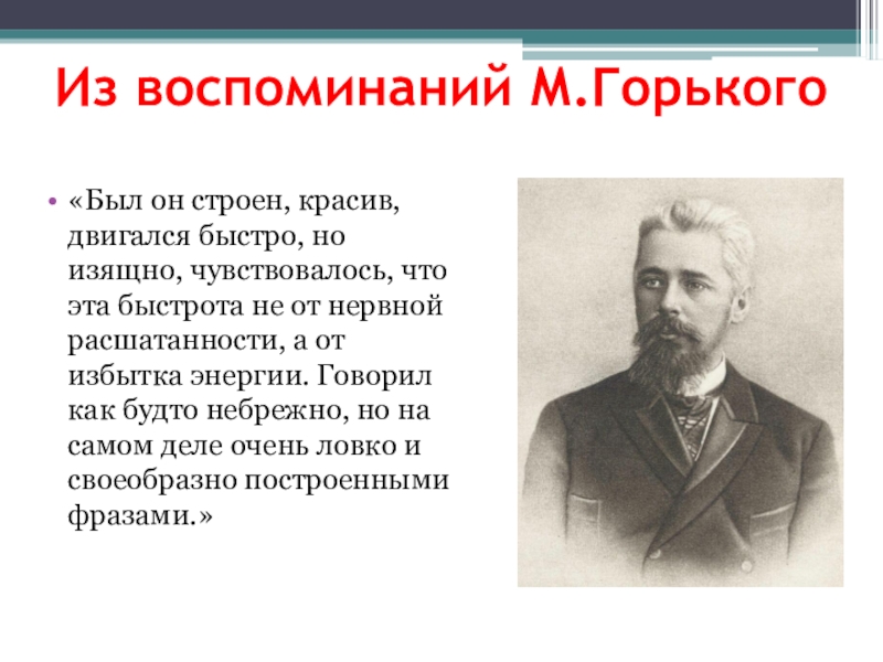 «Жил широко, угощая знакомых изысканными завтраками и обедами, дорогим вином. Сам ел и пил так мало, что нельзя было понять: чем же питается его неукротимая энергия? Любил делать подарки и вообще любил делать приятное людям… Принимая жизнь как праздник, он бессознательно заботился, чтоб и окружающие его так же принимали её».
