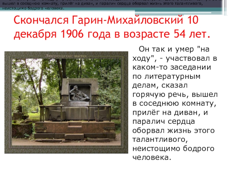 Он так и умер "на ходу", - участвовал в каком-то заседании по литературным делам, сказал горячую речь, вышел в соседнюю комнату, прилёг на диван, и паралич сердца оборвал жизнь этого талантливого, неистощимо бодрого человека.