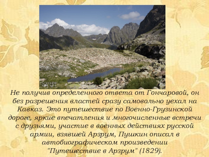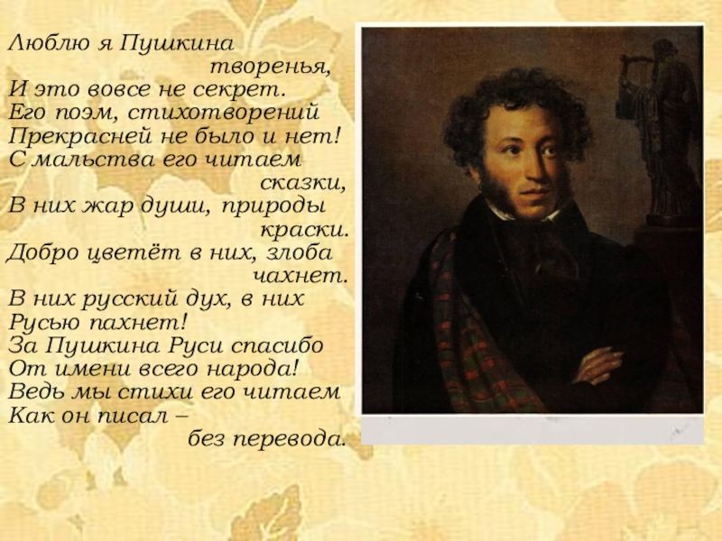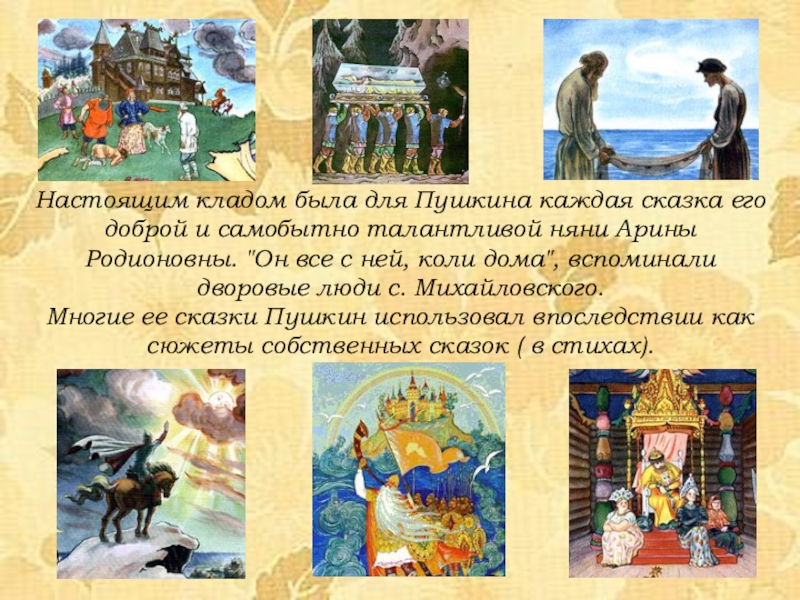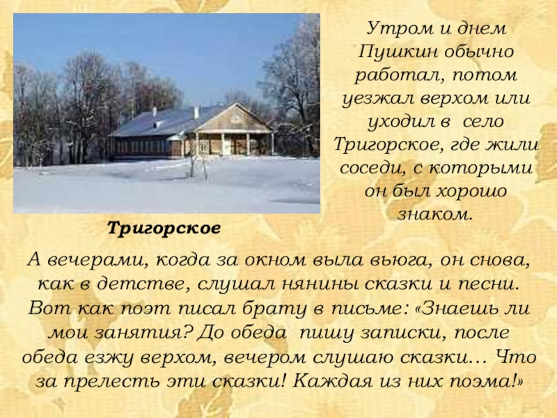 А вечерами, когда за окном выла вьюга, он снова, как в детстве, слушал нянины сказки и песни. Вот как поэт писал брату в письме: «Знаешь ли мои занятия? До обеда пишу записки, после обеда езжу верхом, вечером слушаю сказки… Что за прелесть эти сказки! Каждая из них поэма!»