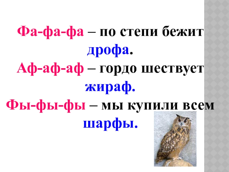 Фа-фа-фа – по степи бежит         дрофа.Аф-аф-аф – гордо шествует