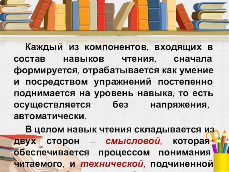 Слайд 6 Каждый из компонентов, входящих в состав навыков чтения, сначала формируется, отрабатывается