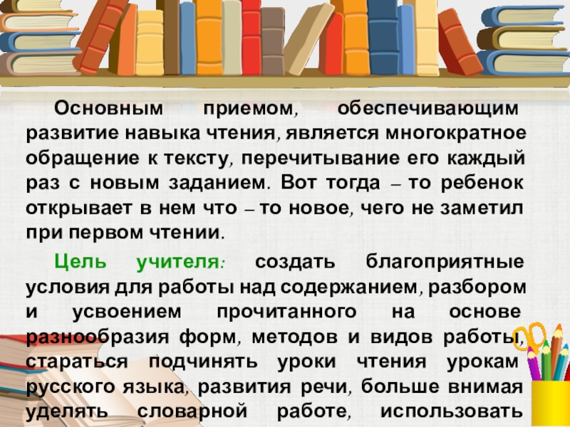 Слайд 23 Основным приемом, обеспечивающим развитие навыка чтения, является многократное обращение к тексту,