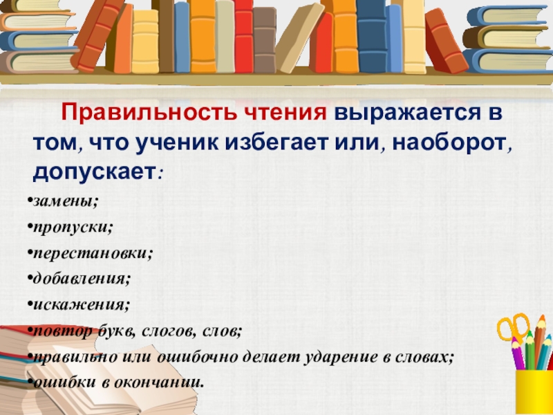 Слайд 12 Правильность чтения выражается в том, что ученик избегает или, наоборот, допускает: