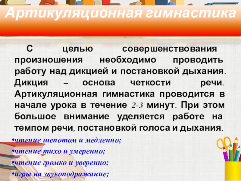 С целью совершенствования произношения необходимо проводить работу над дикцией и