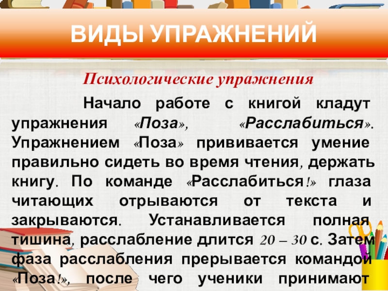 упражнения «Поза», «Расслабиться». Упражнением «Поза» прививается умение правильно сидеть во время чтения, держать книгу. По команде «Расслабиться!» глаза читающих отрываются от текста и закрываются. Устанавливается полная тишина, расслабление длится 20 – 30 с. Затем фаза расслабления прерывается командой «Поза!», после чего ученики принимают правильную позицию и вновь приступают к чтению.