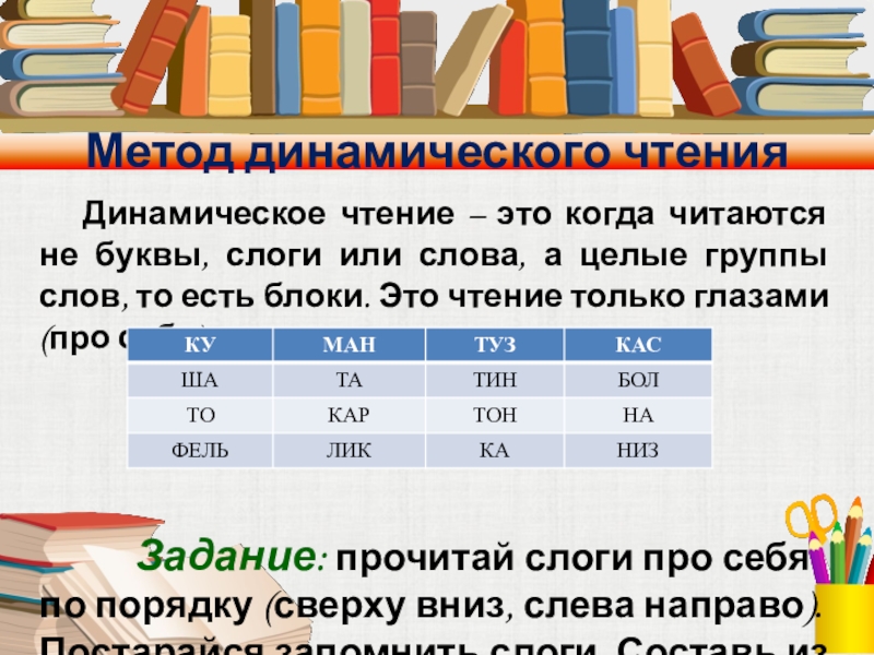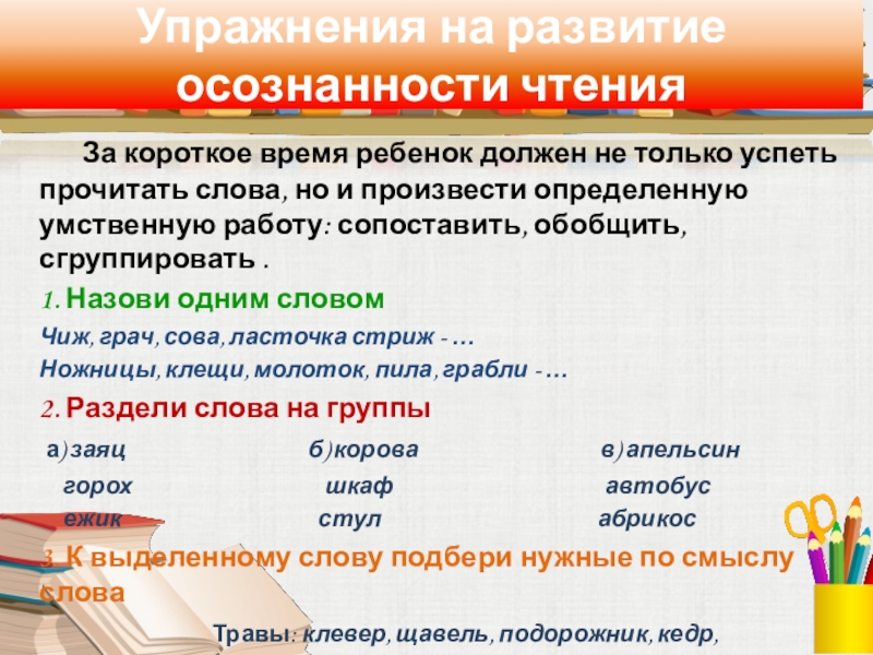 успеть прочитать слова, но и произвести определенную умственную работу: сопоставить, обобщить, сгруппировать .