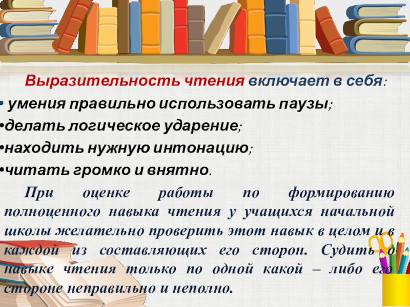 При оценке работы по формированию полноценного навыка чтения у учащихся начальной школы желательно проверить этот навык в целом и в каждой из составляющих его сторон. Судить о навыке чтения только по одной какой – либо его стороне неправильно и неполно.