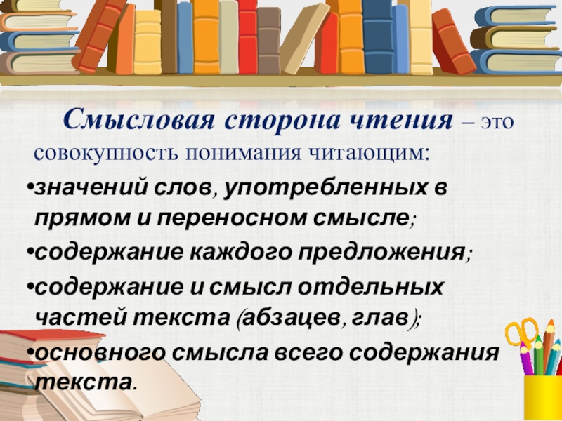 Слайд 8 Смысловая сторона чтения – это совокупность понимания читающим: