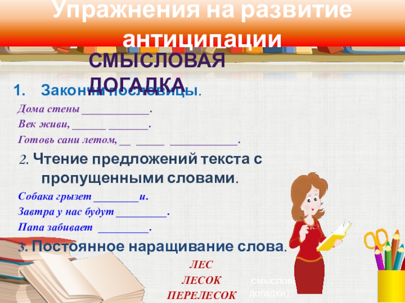 Упражнения, развивающие гибкость и скорость чтения вслух и про себя, умение угадывать последующий текст