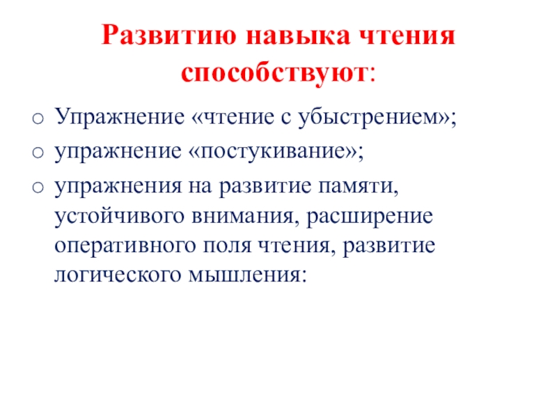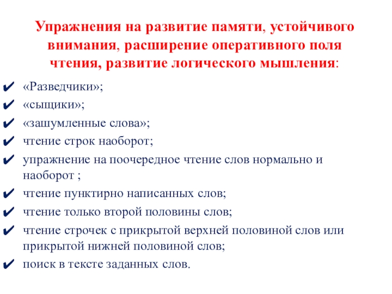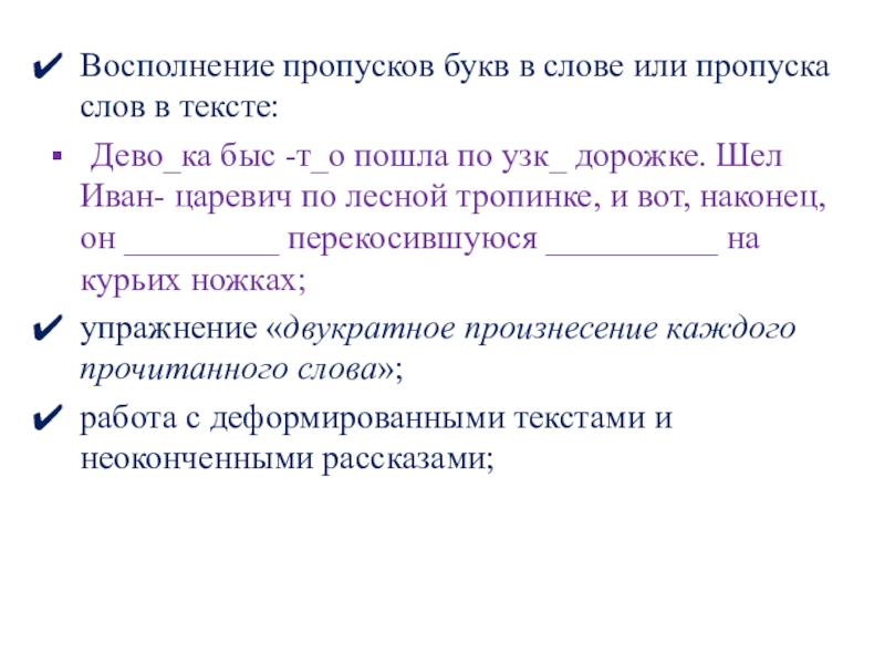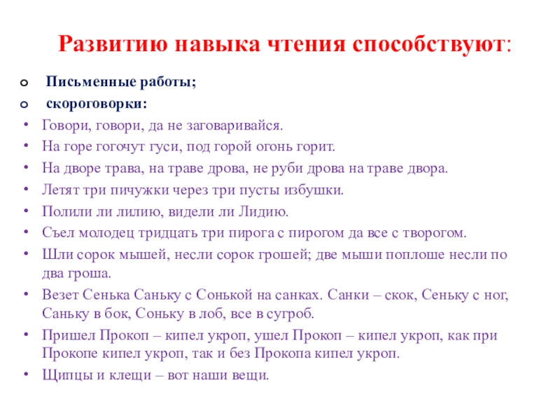 -развитие умения одновременно с чтением вслух одного слова на основе усвоенного содержания по началу, по контурам угадать 2-3 последующих;