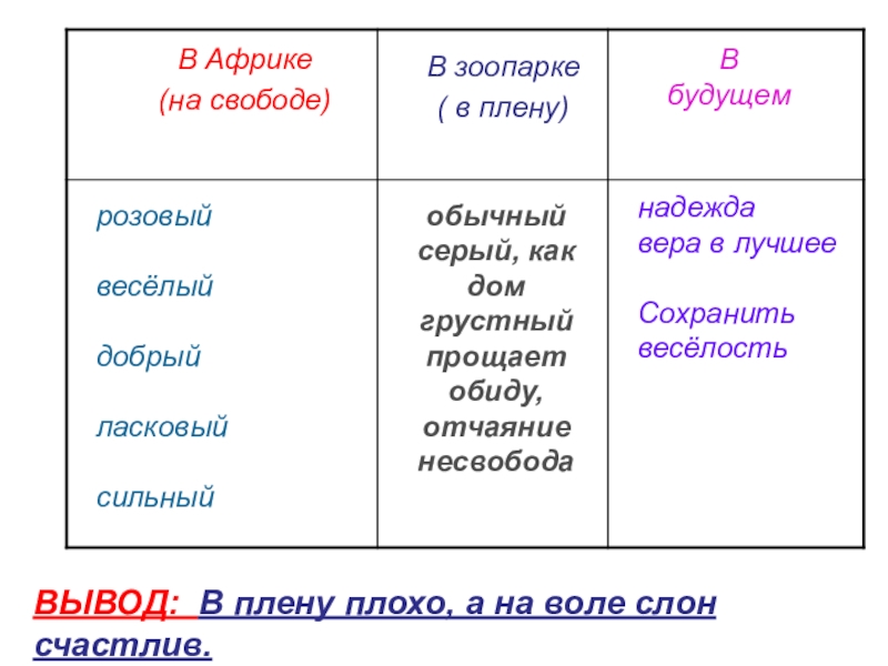 ВЫВОД: В плену плохо, а на воле слон счастлив.