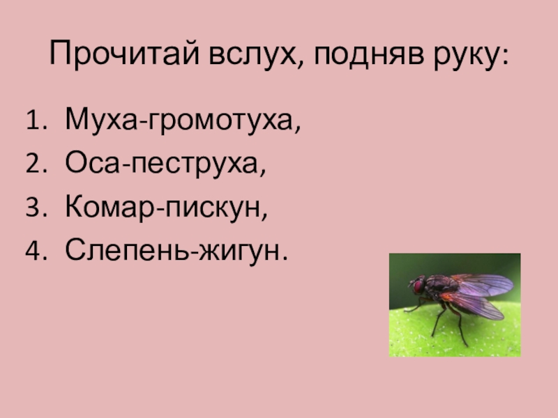 Прочитай вслух, подняв руку:Муха-громотуха,Оса-пеструха,Комар-пискун,Слепень-жигун.