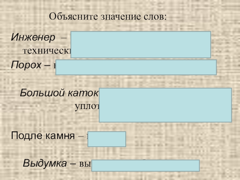 Объясните значение слов:Инженер  – специалист с высшим 						техническим образованием.Порох – взрывчатое соединение или смесь. Большой каток – машина для