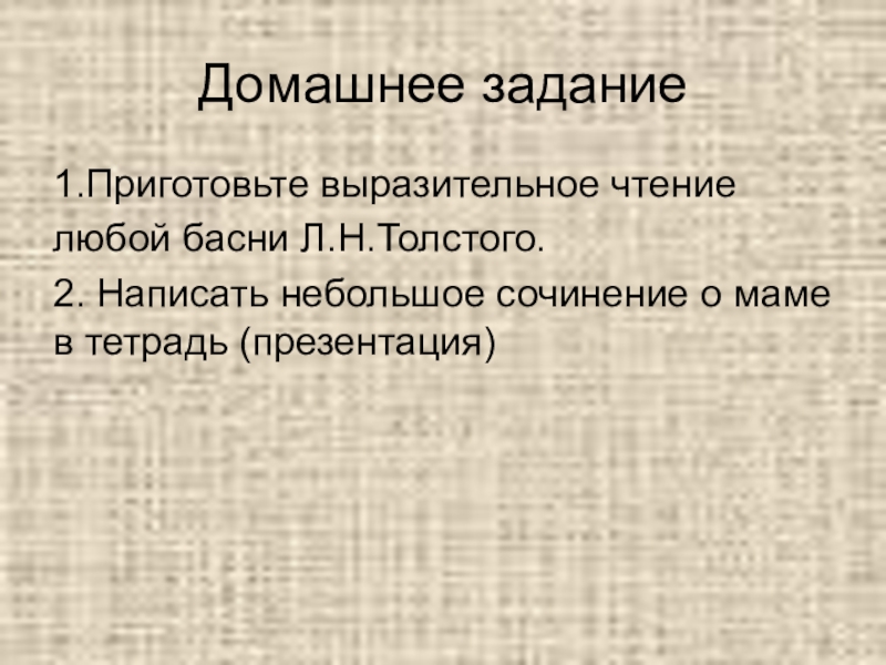 Домашнее задание1.Приготовьте выразительное чтениелюбой басни Л.Н.Толстого.2. Написать небольшое сочинение о маме в тетрадь (презентация)