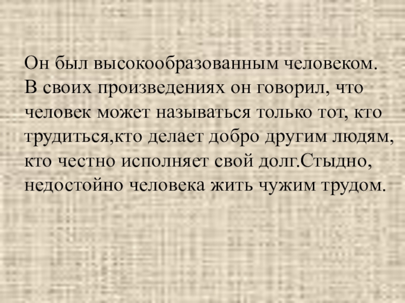 Слайд 5 Он был высокообразованным человеком. В своих произведениях он говорил, что человек может