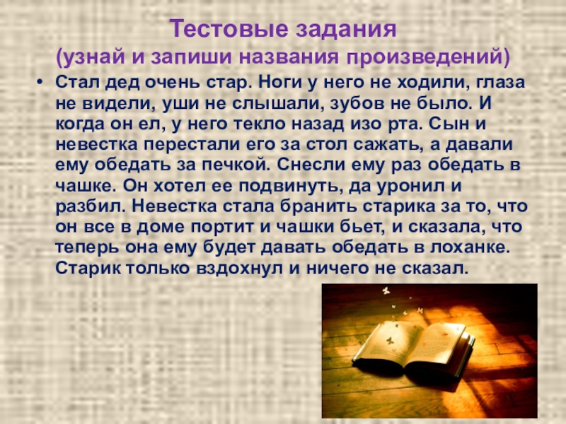 Тестовые задания (узнай и запиши названия произведений)Стал дед очень стар. Ноги у него не ходили, глаза не