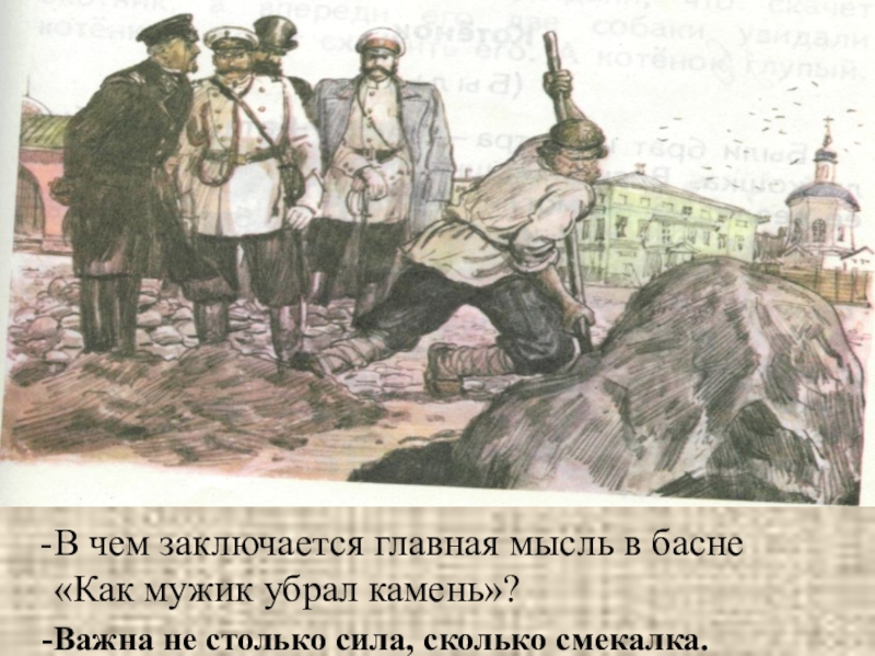 В чем заключается главная мысль в басне «Как мужик убрал камень»? Важна не столько сила, сколько смекалка.