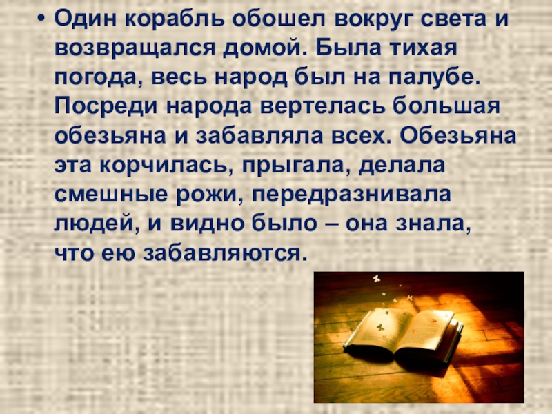 весь народ был на палубе. Посреди народа вертелась большая обезьяна и забавляла всех. Обезьяна эта корчилась, прыгала, делала смешные рожи, передразнивала людей, и видно было – она знала, что ею забавляются.