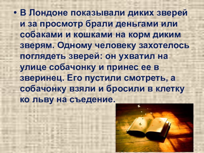 собаками и кошками на корм диким зверям. Одному человеку захотелось поглядеть зверей: он ухватил на улице собачонку и принес ее в зверинец. Его пустили смотреть, а собачонку взяли и бросили в клетку ко льву на съедение.
