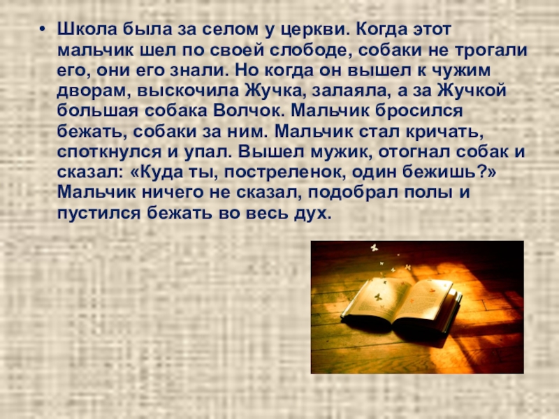 Школа была за селом у церкви. Когда этот мальчик шел по своей слободе, собаки не трогали его,