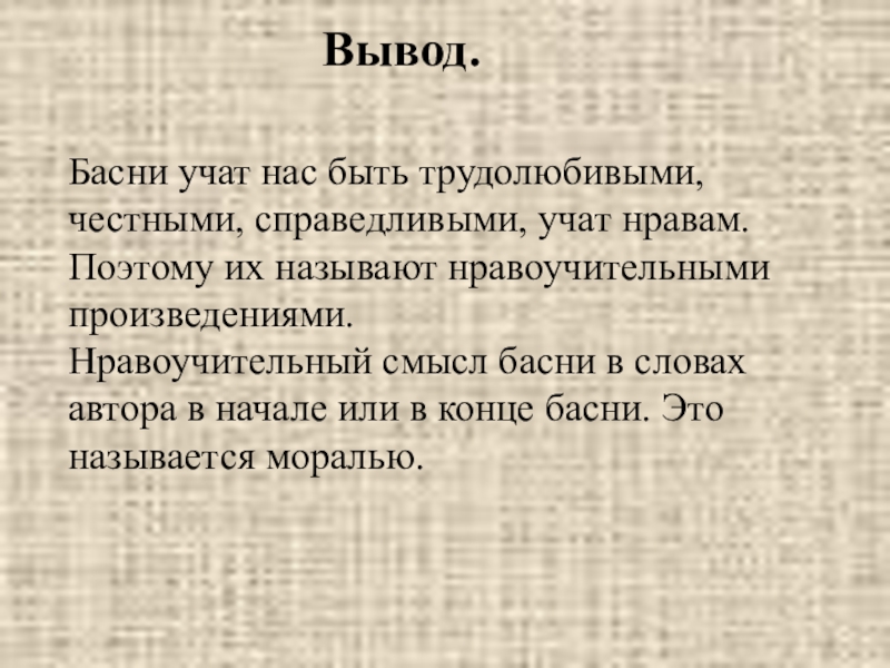 Вывод. Басни учат нас быть трудолюбивыми, честными, справедливыми, учат нравам. Поэтому их называют нравоучительными произведениями. Нравоучительный смысл