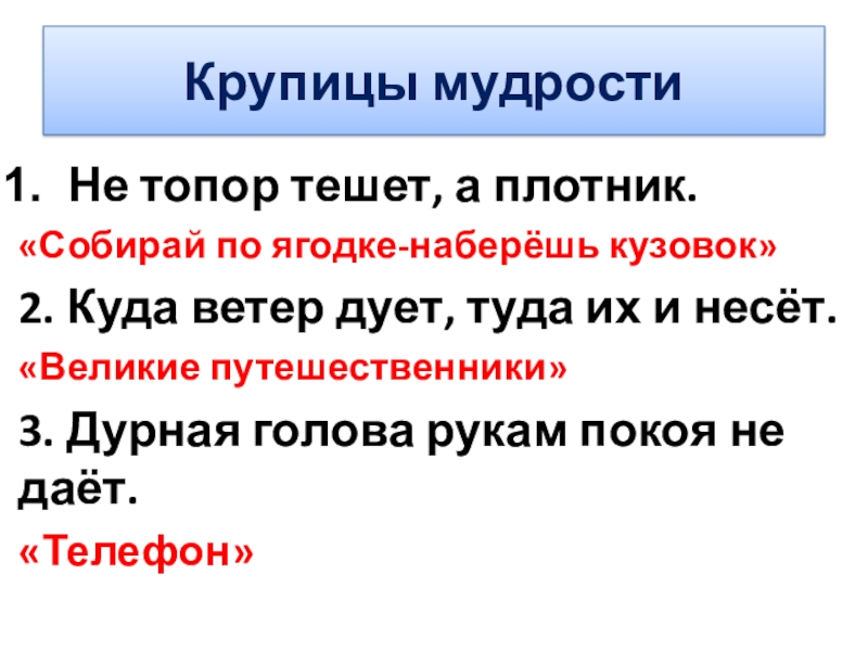 Крупицы мудростиНе топор тешет, а плотник.«Собирай по ягодке-наберёшь кузовок»2. Куда ветер дует, туда их и несёт.«Великие путешественники»3.
