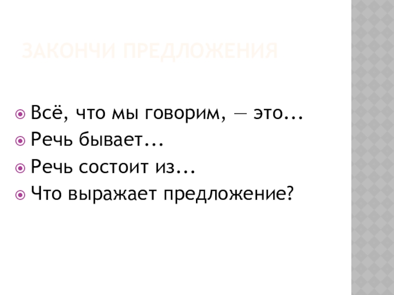 Закончи предложенияВсё, что мы говорим, — это... Речь бывает... Речь состоит из... Что выражает предложение?