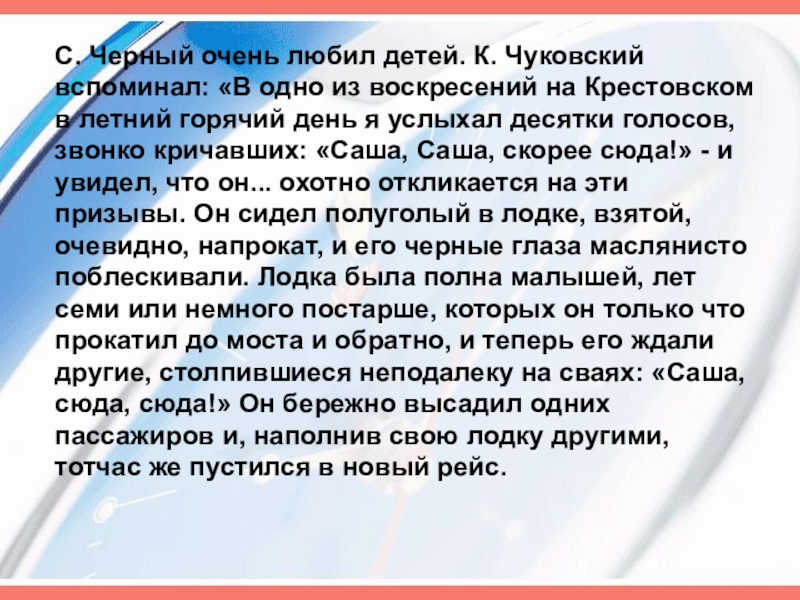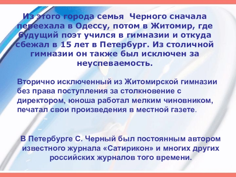 В Петербурге С. Черный был постоянным автором известного журнала «Сатирикон» и многих других российских журналов того времени.