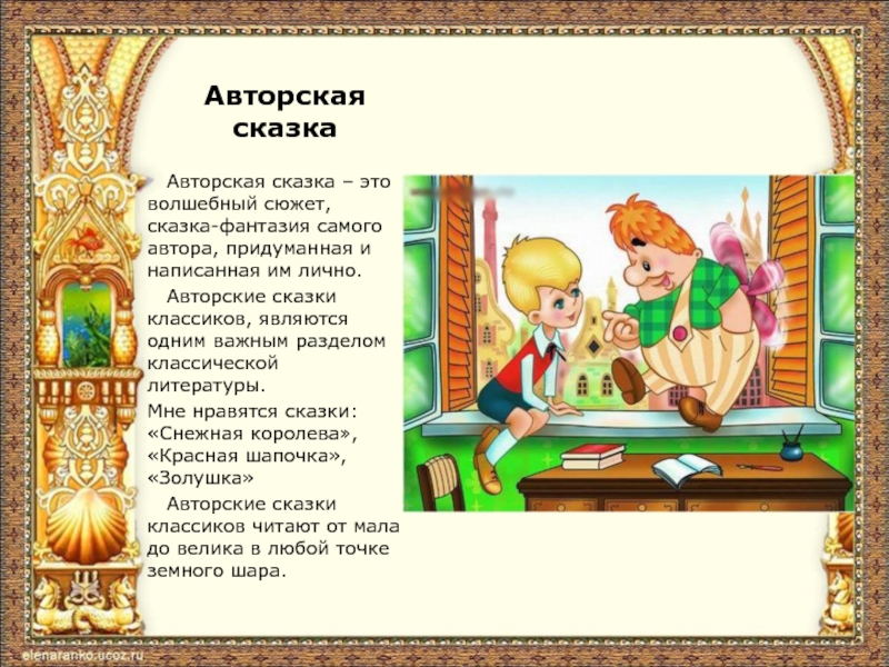 Авторская сказка  Авторская сказка – это волшебный сюжет, сказка-фантазия самого автора, придуманная и написанная им лично.