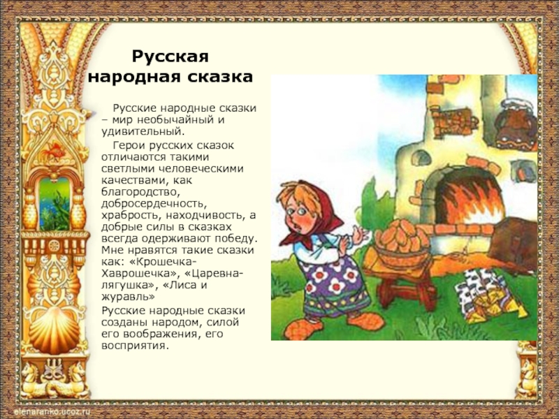 Герои русских сказок отличаются такими светлыми человеческими качествами, как благородство, добросердечность, храбрость, находчивость, а добрые силы в сказках всегда одерживают победу. Мне нравятся такие сказки как: «Крошечка-Хаврошечка», «Царевна- лягушка», «Лиса и журавль»