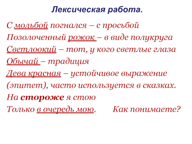 Лексическая работа. С мольбой погнался – с просьбойПозолоченный рожок – в виде полукруга Светлоокий – тот, у