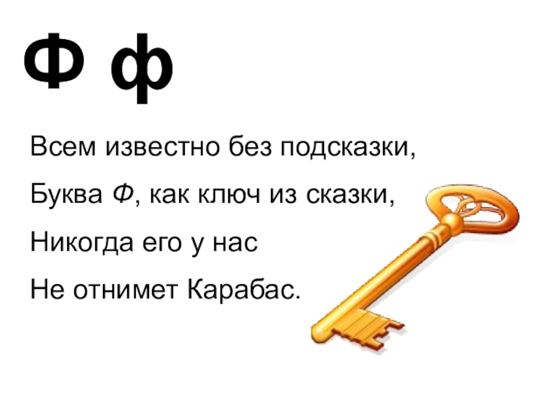 Ф фВсем известно без подсказки,Буква Ф, как ключ из сказки,Никогда его у насНе отнимет Карабас.