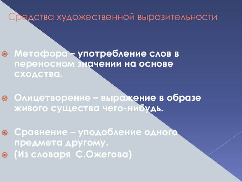 Средства художественной выразительности Метафора – употребление слов в переносном значении на основе сходства.Олицетворение – выражение в образе