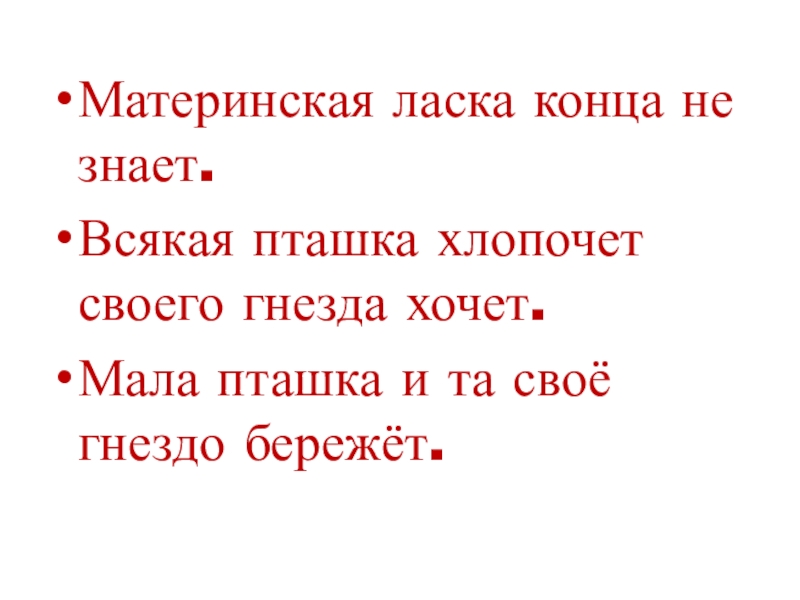 Материнская ласка конца не знает.Всякая пташка хлопочет своего гнезда хочет.Мала пташка и та своё гнездо бережёт.