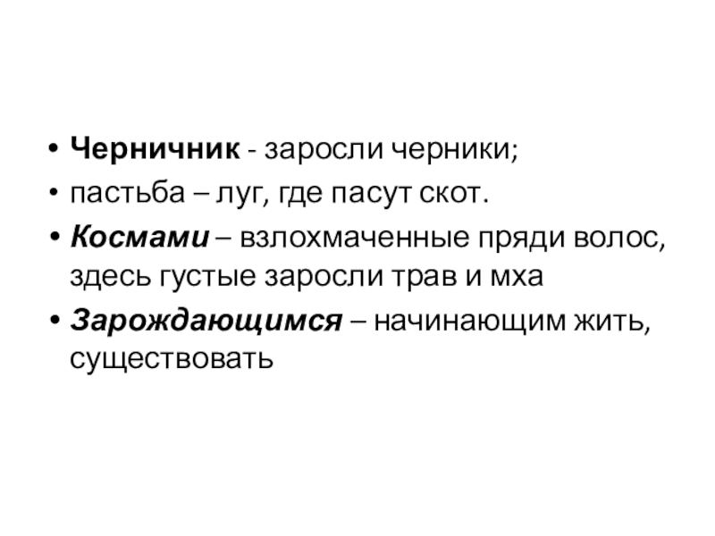Черничник - заросли черники;пастьба – луг, где пасут скот. Космами – взлохмаченные пряди волос, здесь густые заросли