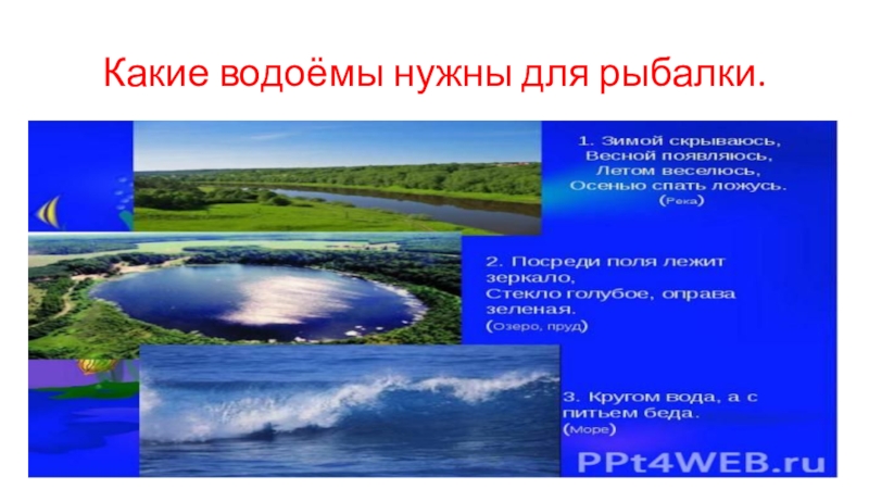 Слайд 3Какие водоёмы нужны для рыбалки.