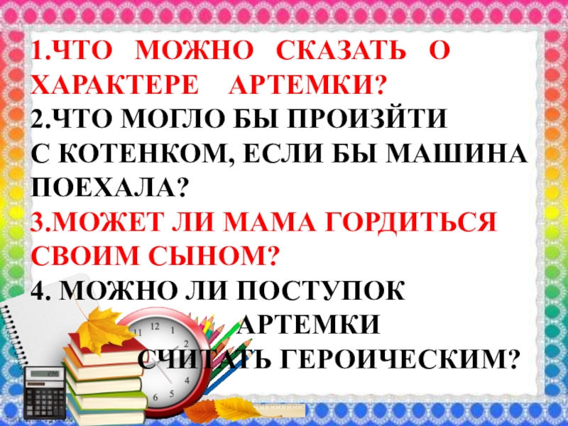 1.ЧТО  МОЖНО  СКАЗАТЬ  ОХАРАКТЕРЕ  АРТЕМКИ?2.ЧТО МОГЛО БЫ ПРОИЗЙТИ С КОТЕНКОМ, ЕСЛИ БЫ МАШИНАПОЕХАЛА?3.МОЖЕТ