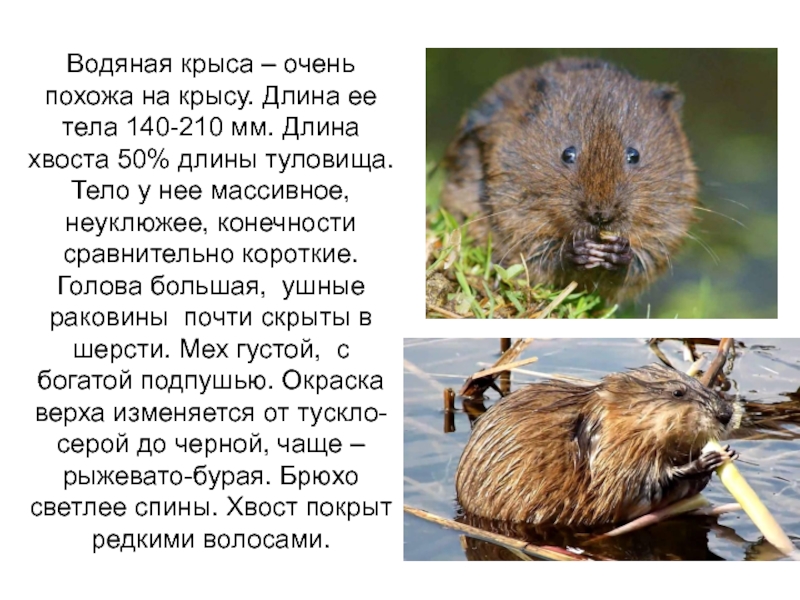 Слайд 2Водяная крыса – очень похожа на крысу. Длина ее тела 140-210