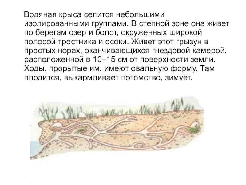 Слайд 4 Водяная крыса селится небольшими изолированными группами. В степной зоне