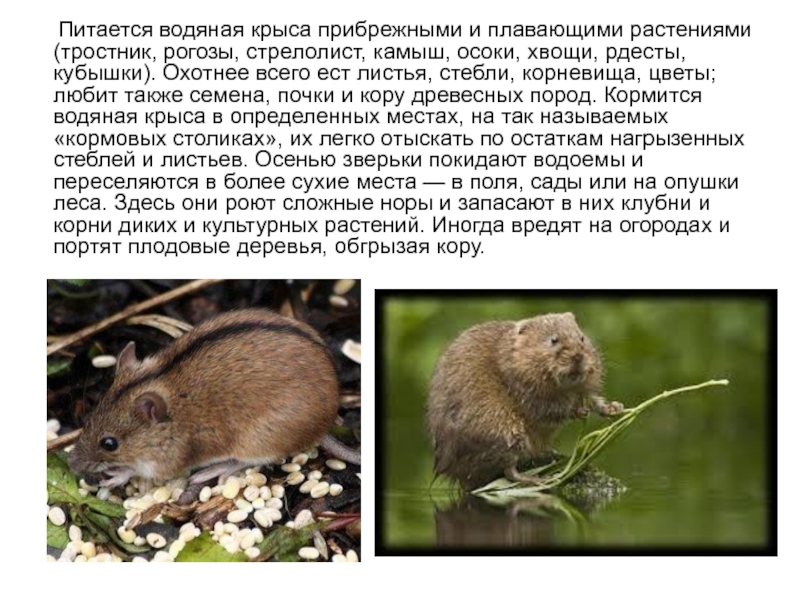 (тростник, рогозы, стрелолист, камыш, осоки, хвощи, рдесты, кубышки). Охотнее всего ест листья, стебли, корневища, цветы; любит также семена, почки и кору древесных пород. Кормится водяная крыса в определенных местах, на так называемых «кормовых столиках», их легко отыскать по остаткам нагрызенных стеблей и листьев. Осенью зверьки покидают водоемы и переселяются в более сухие места — в поля, сады или на опушки леса. Здесь они роют сложные норы и запасают в них клубни и корни диких и культурных растений. Иногда вредят на огородах и портят плодовые деревья, обгрызая кору.