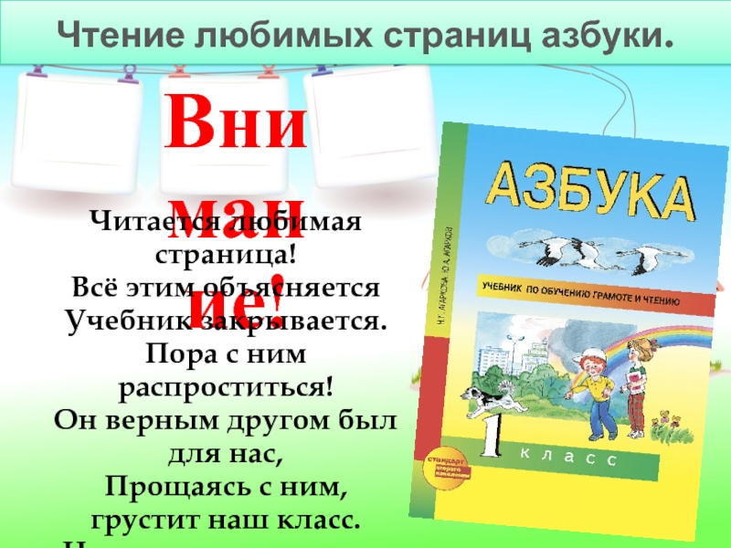 Чтение любимых страниц азбуки.Внимание!  Читается любимая страница!Всё этим объясняется  Учебник закрывается.  Пора с ним