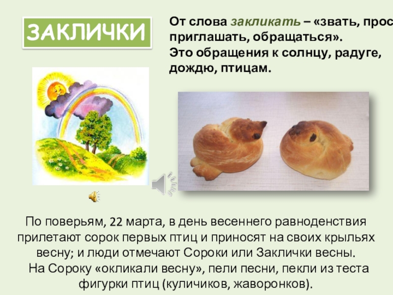 На Сороку «окликали весну», пели песни, пекли из теста фигурки птиц (куличиков, жаворонков).