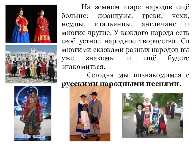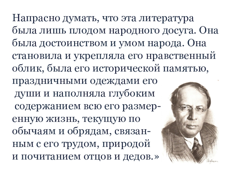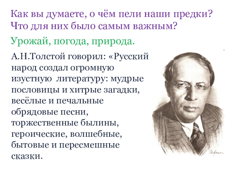 А.Н.Толстой говорил: «Русский народ создал огромную изустную литературу: мудрые пословицы и хитрые загадки, весёлые и печальные обрядовые песни, торжественные былины, героические, волшебные, бытовые и пересмешные сказки.